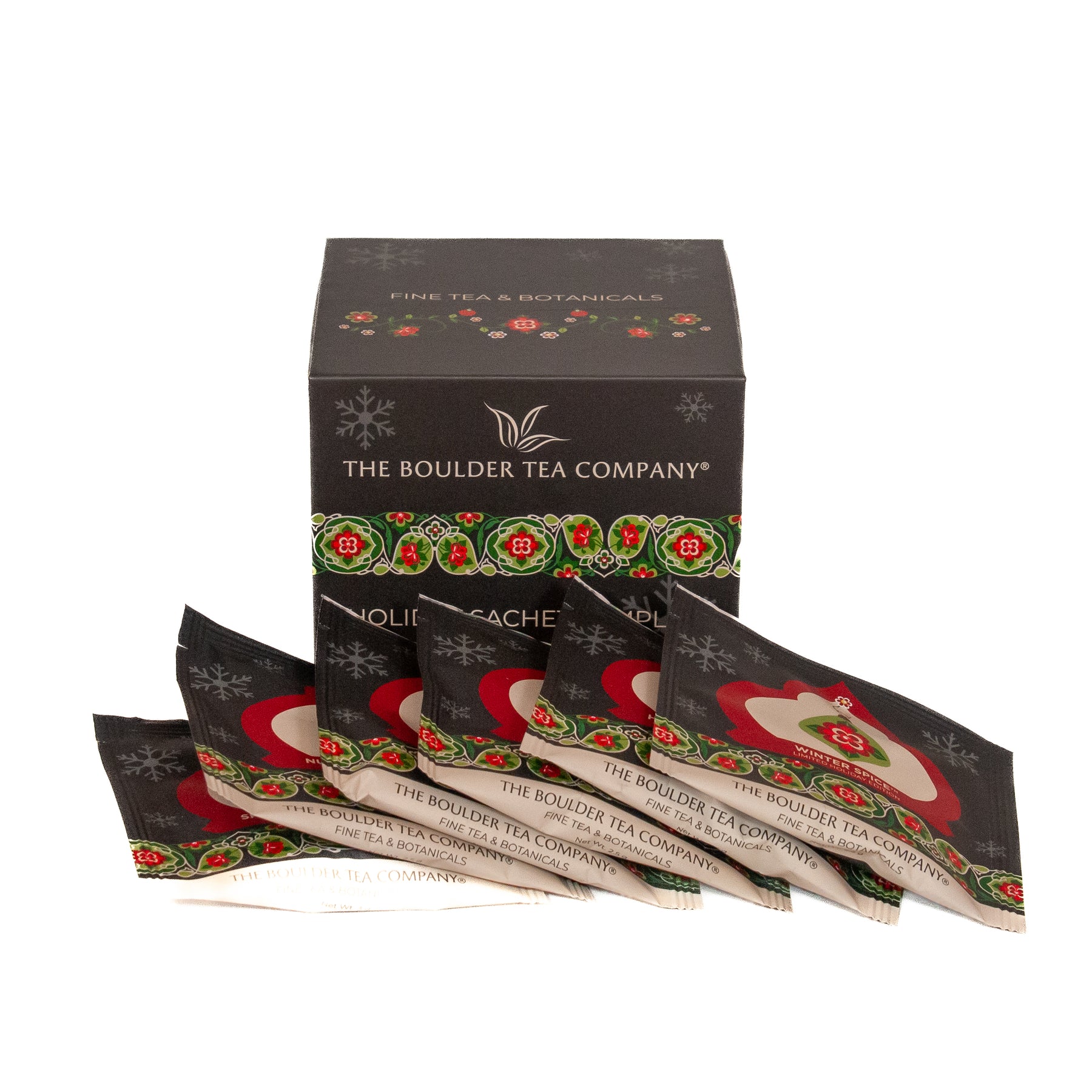 Sachets include Holiday Gingersnap™ Flavored Black Tea, Fireside Eggnog™ Holiday Flavored Black Tea, Nutcracker Dream™ Holiday Flavored Black Tea, Winter Spice™ Holiday Flavored Black Tea, & Spicy White Christmas™ Holiday Flavored White Tea. The perfect gift for the tea lover in your life, or even for yourself if you'd like to try a variety of flavors.